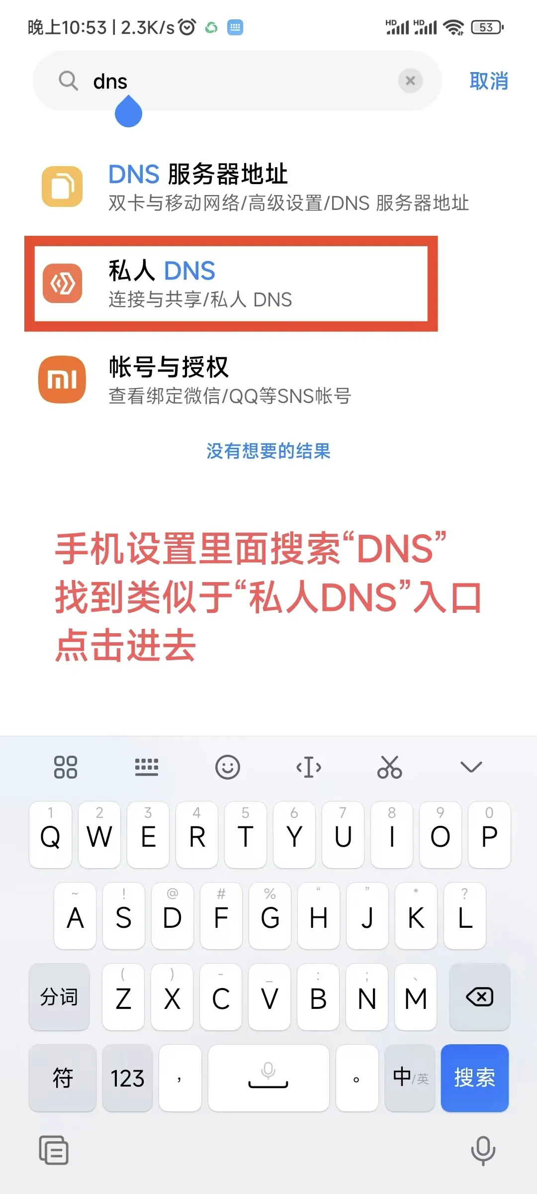 第一步,打开手机设置,搜索“DNS”,一般都是这个。我以小米手机为例,找到“私人DNS”,华为的好像叫“加密DNS”